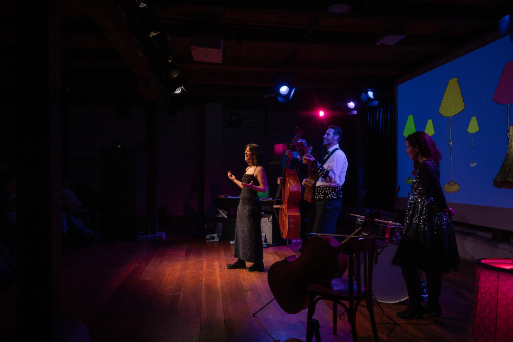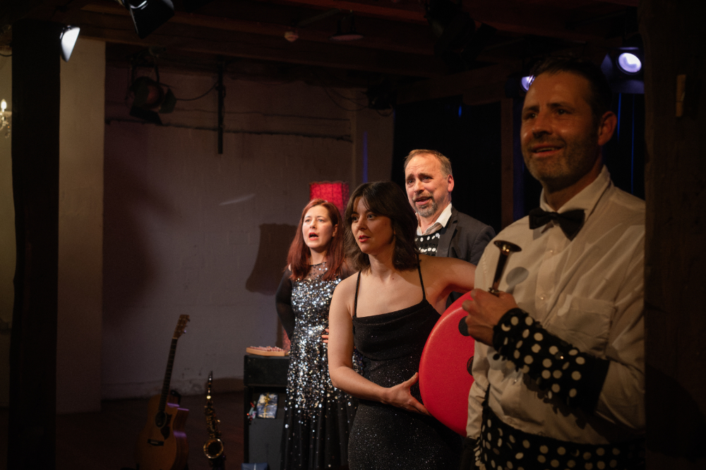 Anja Imig, Thomas Matschoss, Marit Persiel, India Eva-Maria Roth und Maurice Schneider, im Sommer noch als Aliens im Landkreis Uelzen unterwegs, packen ihre Instrumente aus, ölen ihre Stimmbänder und verwandeln das Jahrmarkttheater in einen glitzernden Ballsaal.