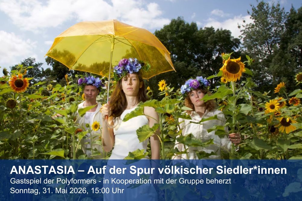 Anastasia– Auf der Spur völkischer Siedler*innen führt als dokumentarische Theaterreise hinter die Kulissen des sektenartigen Siedlerlebens. Drei Performer*innen und eine Livemusikerin zeichnen auf Grundlage von Recherchematerial und Interviews ein spielerisches, informatives und sinnliches Bild der Bewegung.